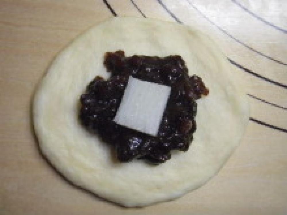 ![]() 生地を平らにし、粒あん20gと④の餅を1個のせ、包む。