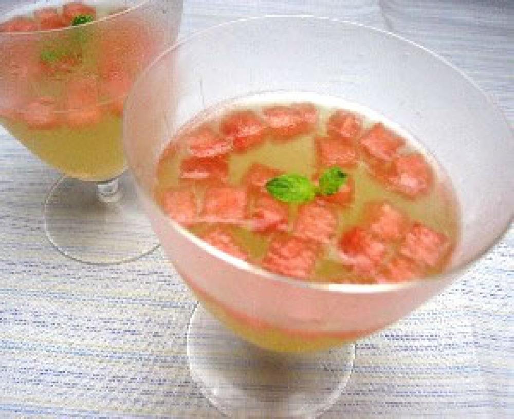 粉ゼラチンを大さじ3の水でふやかしておく。スイカは1cm程度のさいの目に切る。