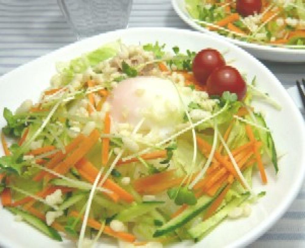 レタスは食べやすい大きさに切り、キュウリ、人参は細切りにする。ツナ缶は油をきっておく。