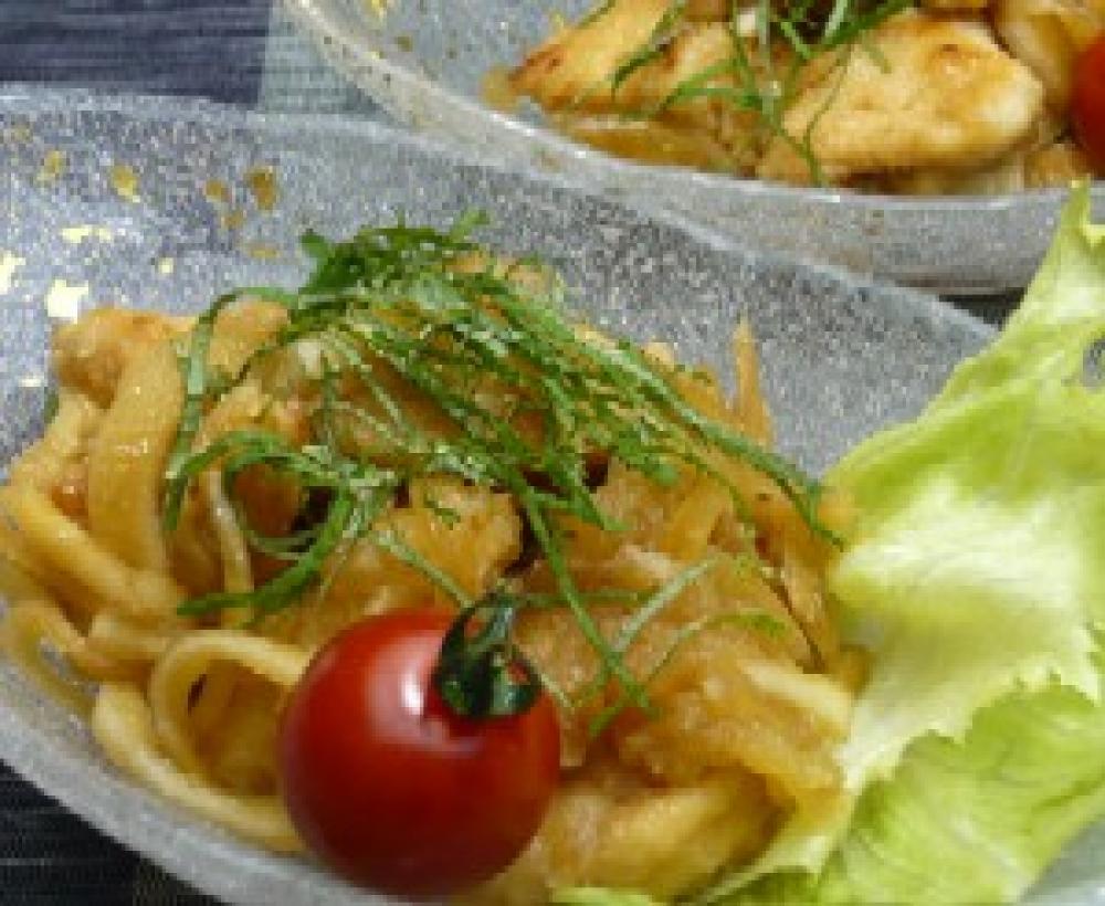鶏むね肉を一口大に切り、小麦粉を軽くまぶす。玉ねぎは薄くスライスする。