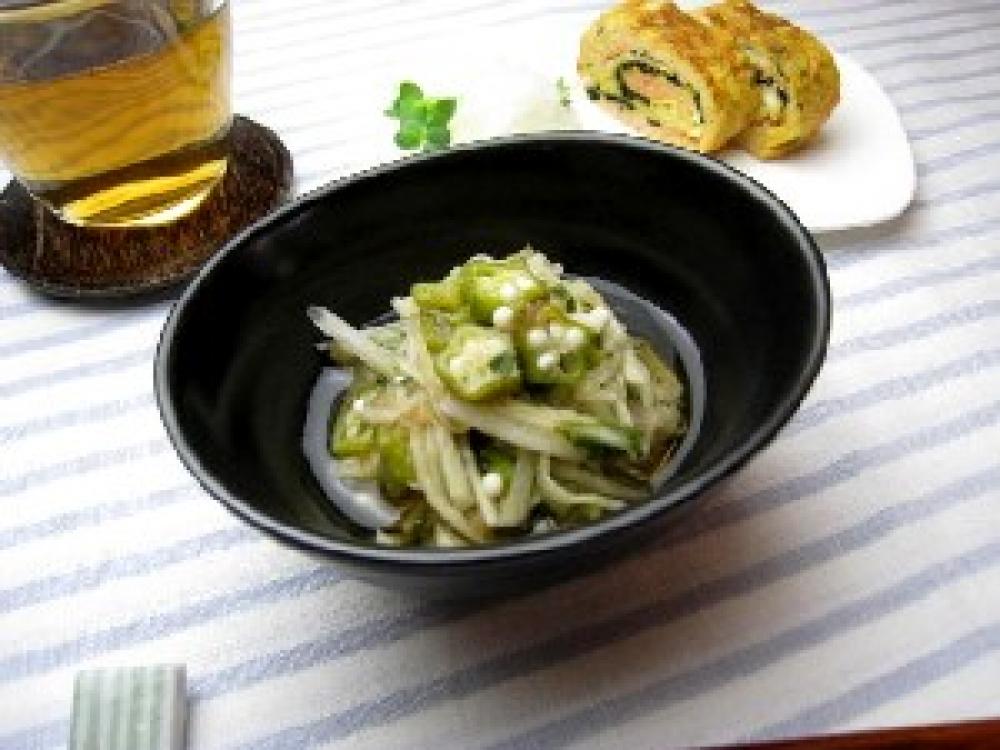 (3)の合わせ酢に、(1)の大根、オクラ、青じそ、(2)の梅ねりを加え、さっと混ぜて出来上がり。