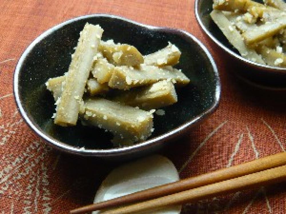 ごぼうを(3)で和えて出来上がり。(※ラカントSが溶けにくい場合はごぼうが温かいうちに和えると良い)