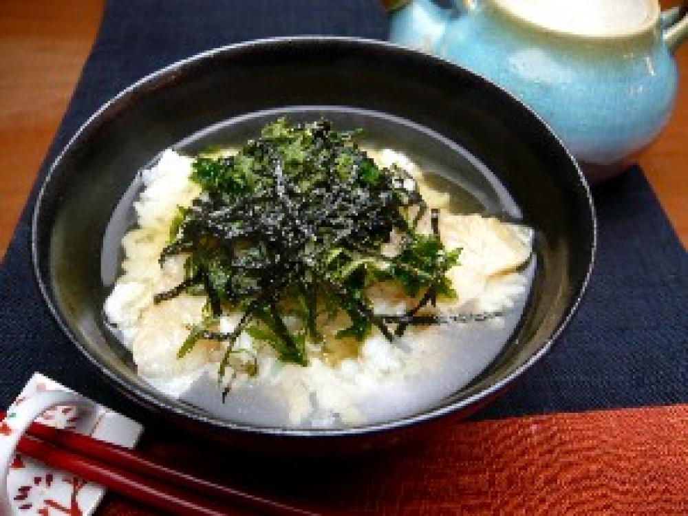 だしの材料をあたため沸騰直前で火からおろし、ごはんのうえからかける。