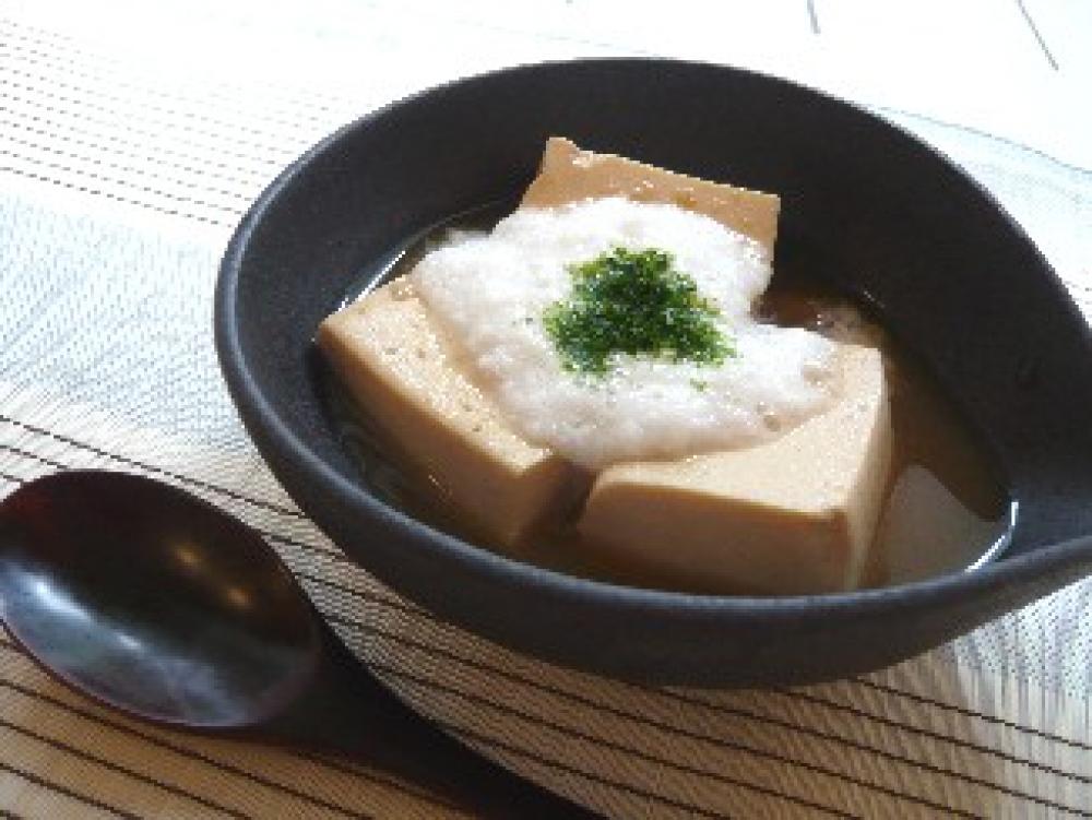 だし汁、しょうゆ、ラカントS、すりおろししょうがを鍋に入れて煮立たせ、食べやすく薄めに切った豆腐を入れて、煮る。