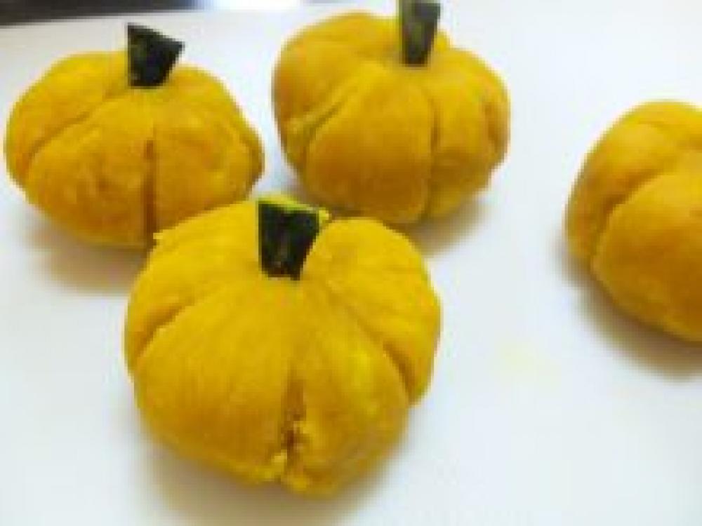 ![]() カボチャを丸める。ラップを使うと手も汚れないよ。