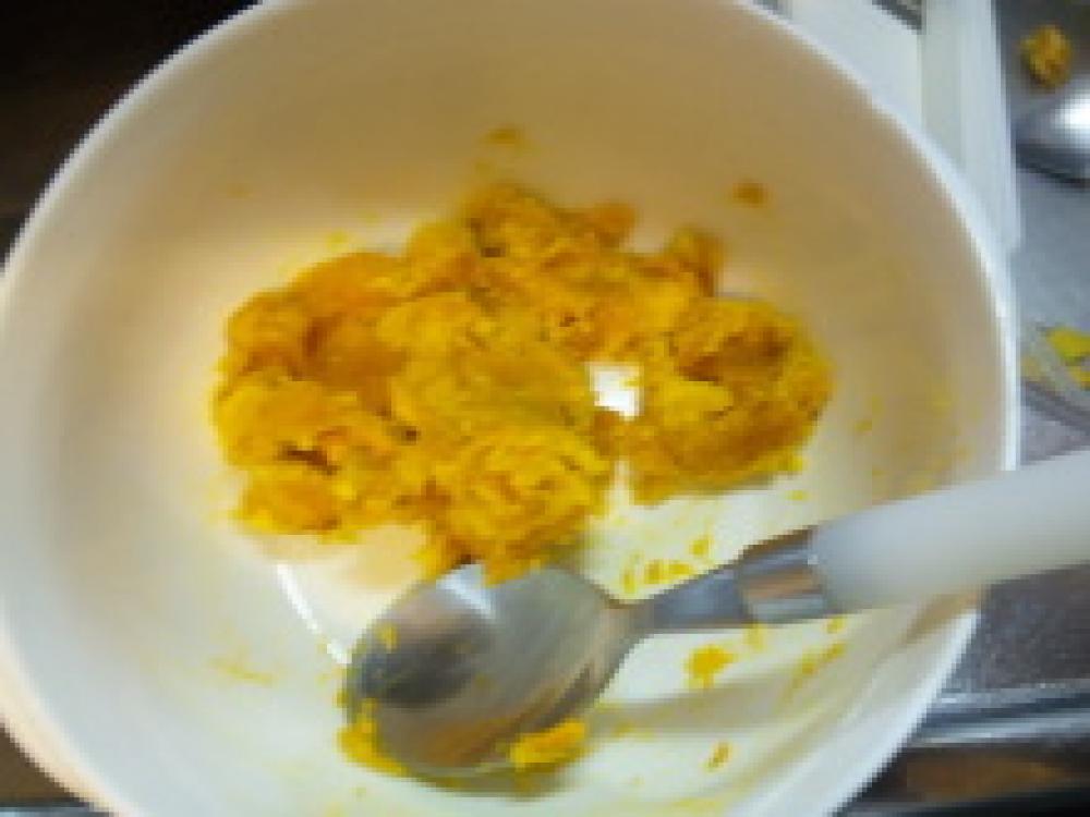 ![]() ラップをしてレンジで柔らかくなるまでチン。皮を取って潰す(皮は少しだけ最後に使うよ~~)