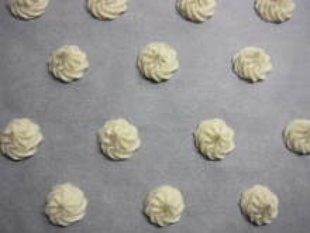 ![]() ⑤の生地を絞り袋に入れ、直径3cmほどに天板に絞り出し、180℃に予熱したオーブンで14~15分焼く。