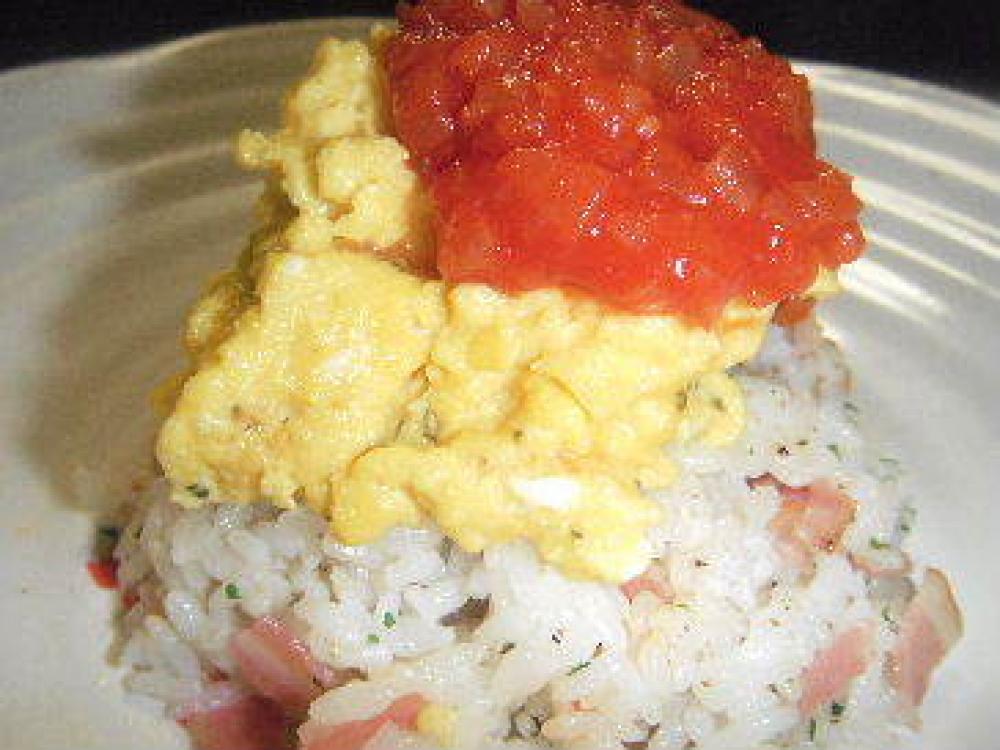 ベーコンガーリックライス→スクランブルエッグ→トマトソースの順で盛り付ける。