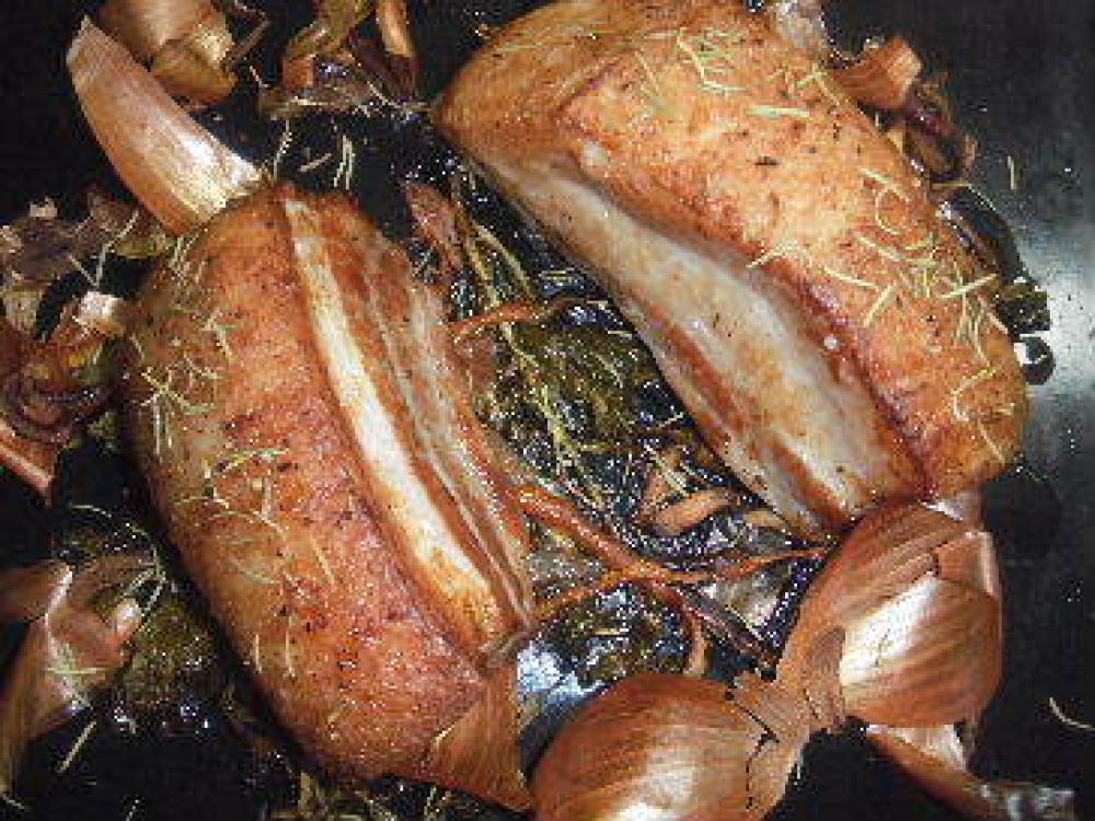 天板に、スライスしたにんにく、くず野菜を敷き詰め、塩豚の表面に焼き色がついたらのせ、ローズリー、ブラックペッパーをふる。