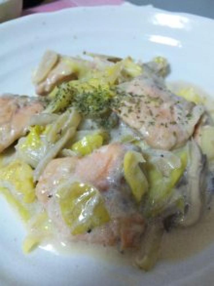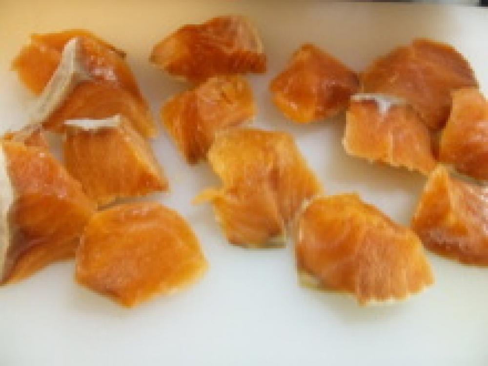 ![]() まずは下ごしらえ。鮭の皮と骨を取る。そして一口大に切る。