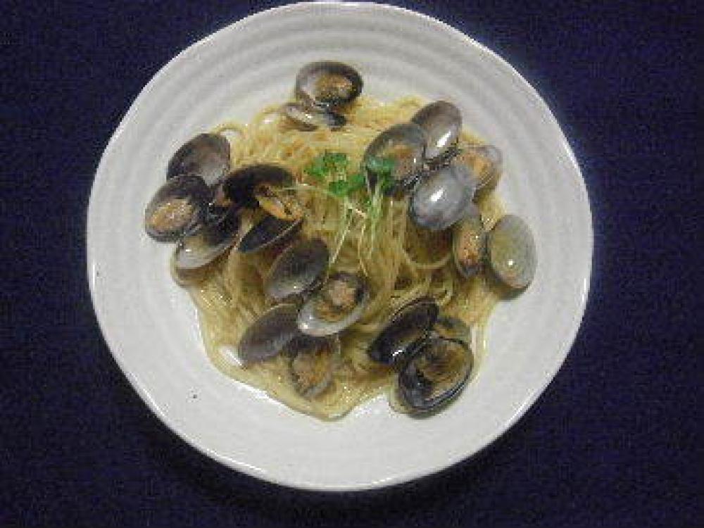 フライパンに、殻付きあさりと酒を入れ、蓋をして、貝が開くまで中火で蒸す。