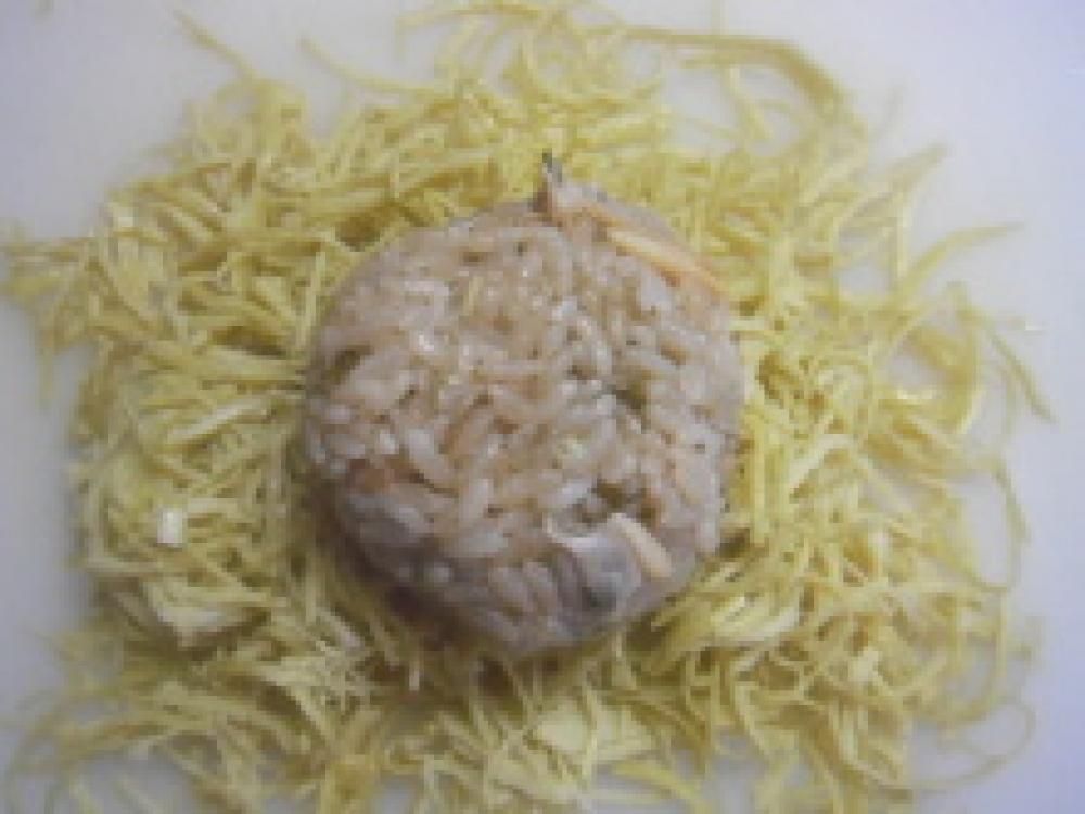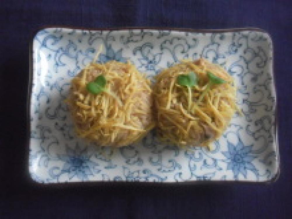 ![]() おにぎりをにぎる。にぎったおにぎりを広げた錦糸卵の上にのせ、両手で包むように、ご飯の周りに錦糸卵をつけてゆく。