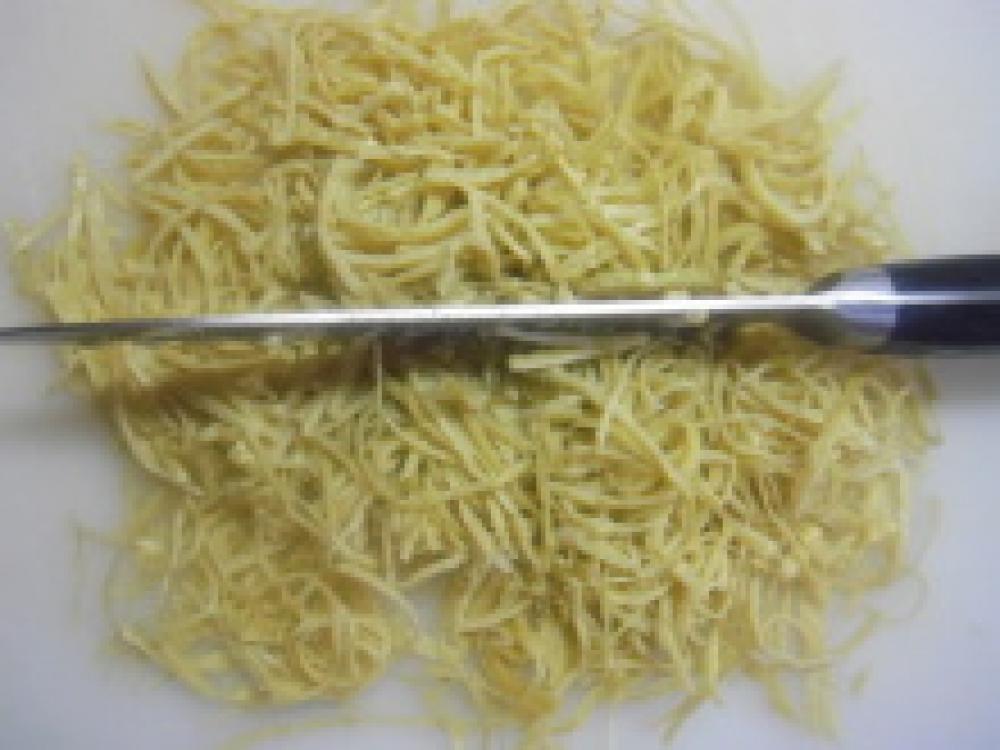 ![]() 昆布茶、桜の花パウダーを湯で溶き、卵に加え、塩を入れ、フライパンで薄く卵液を流し入れて焼き、冷めたら、細く千切りにする。