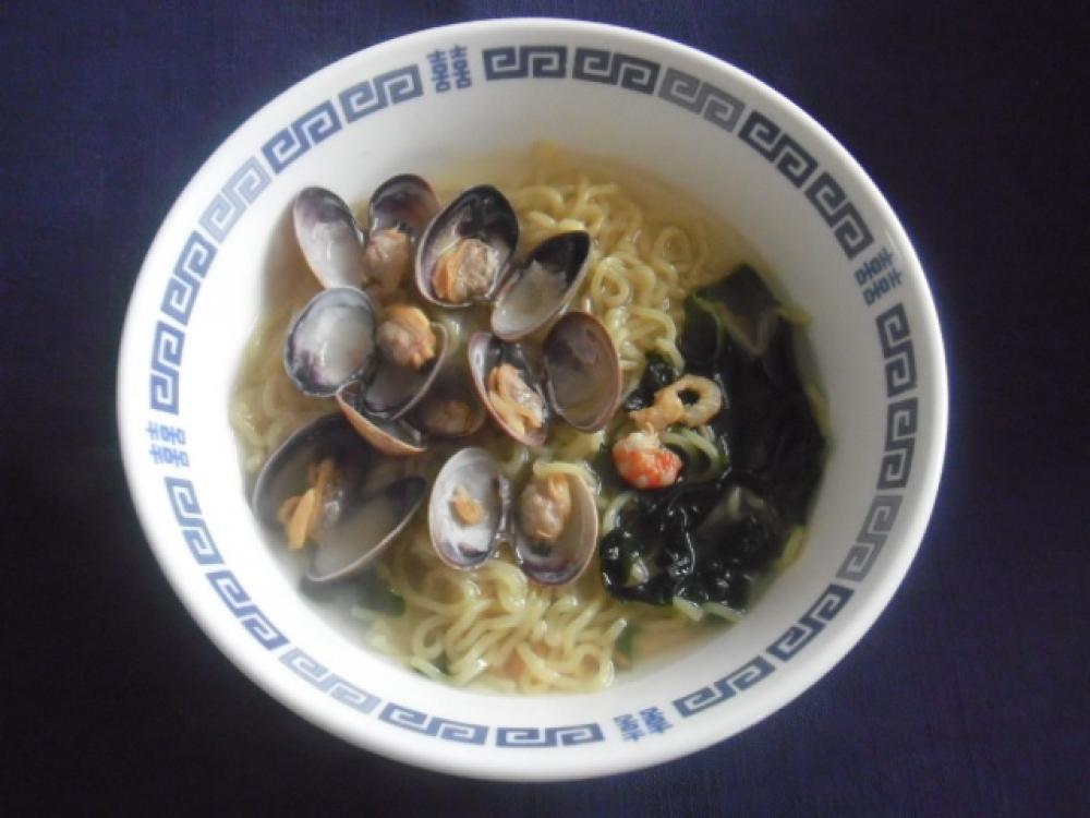 ゆであがった麺を④に入れ、わかめや干しえびを見えるように盛り付け、取り出しておいたあさりをトッピング。