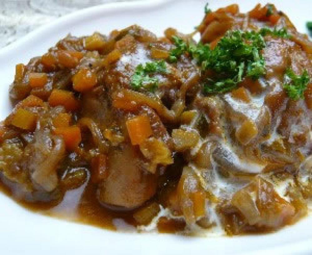 器に盛り付け、好みで生クリームを少量まわしかけ、みじ切りのパセリを散らしてできあがり。