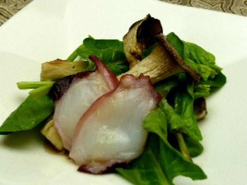 ドレッシングの材料を合わせ、エリンギ、タコ、ほうれん草をもりつけて上からドレッシングをかける。