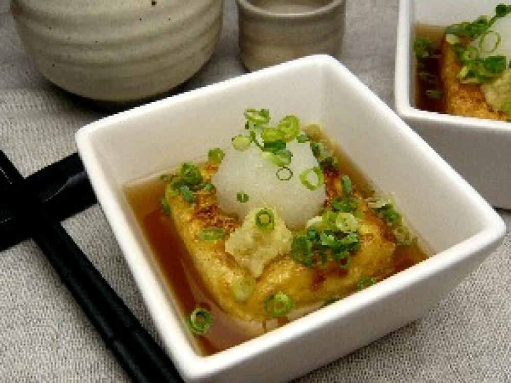 お皿に(1)を盛り付け、上からあんをかけ、大根おろし、しょうが、刻みのりをかけて出来上がり。
