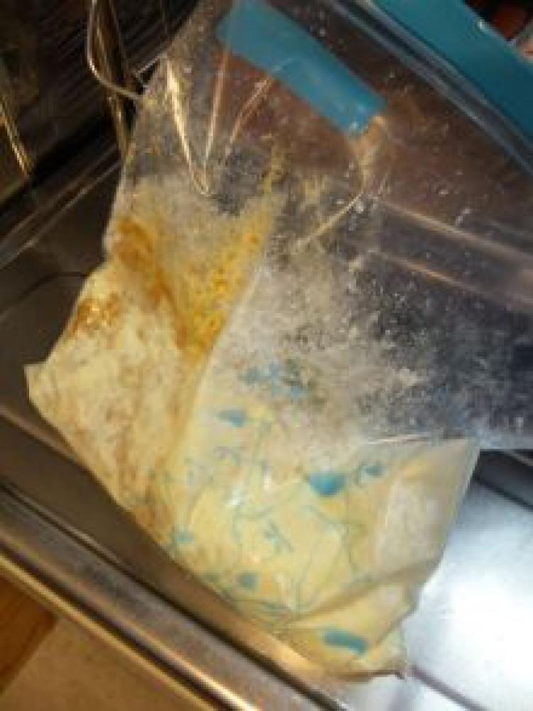 ![]() 袋のまま麺棒で5ミリくらいの厚さに伸ばす。