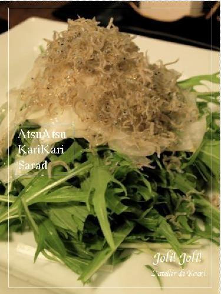 水菜に、さらし玉ねぎを乗せて、少々お塩を振り、ちりめんじゃこをのっけます。