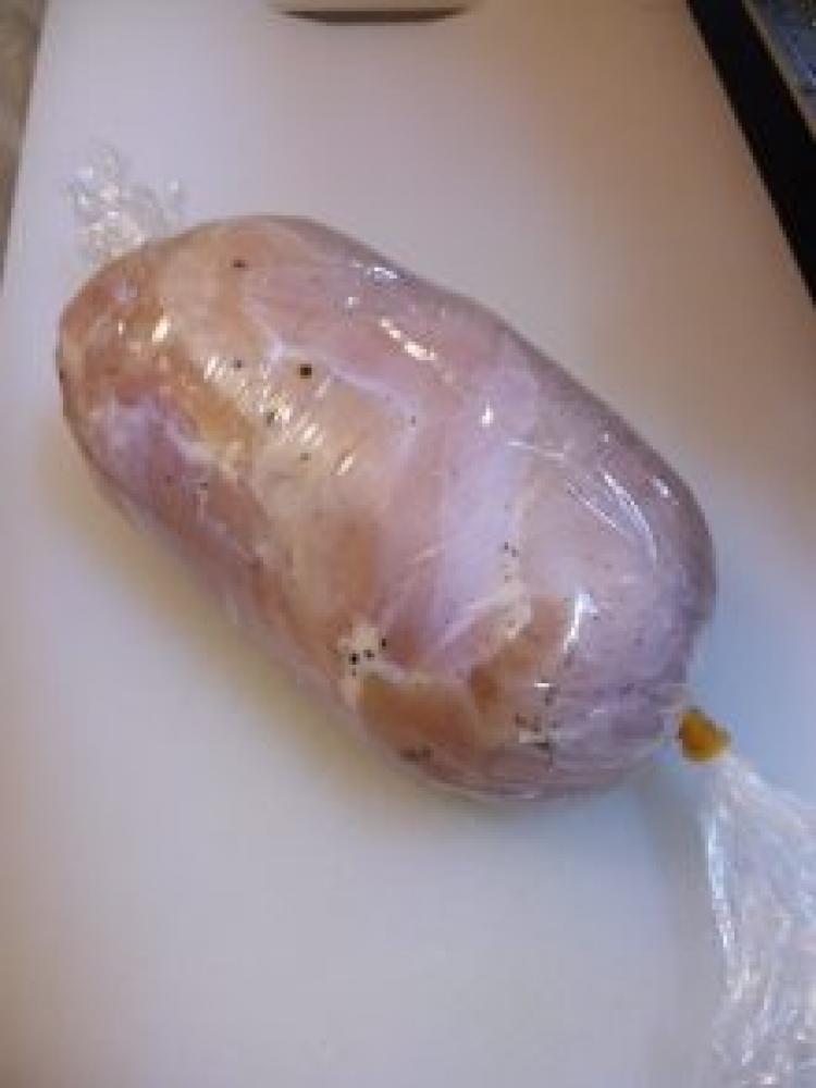 ![]() ラップを広げておき、その上にクッキングペーパーなどで水分を拭き取った鶏肉を互い違いに合わせて包み両端を輪ゴムで閉じる。