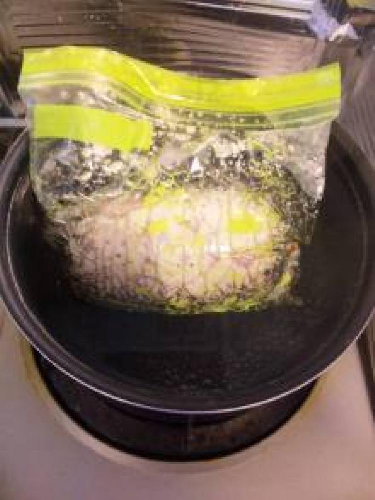 ![]() 更に密封袋に入れてしっかりと閉じ、沸騰した鍋の中に入れすぐに火を止めて蓋をする。