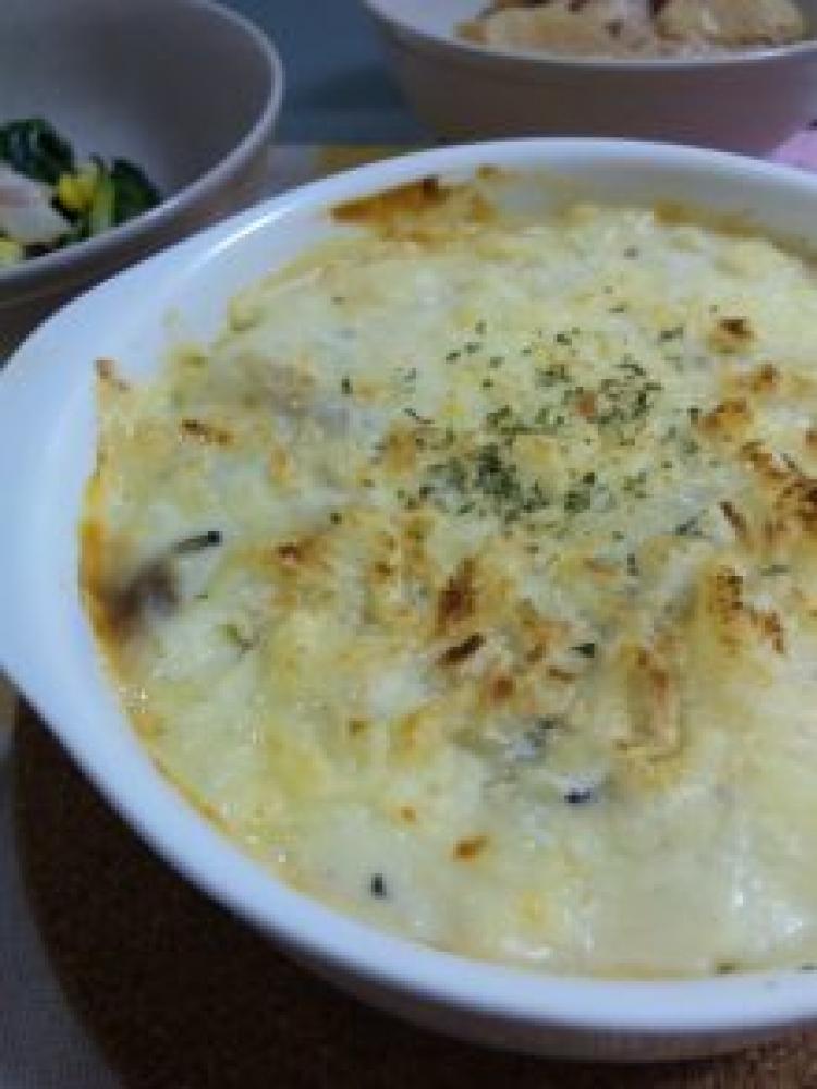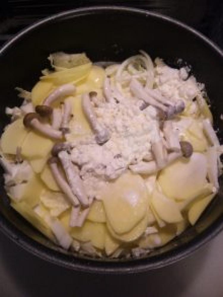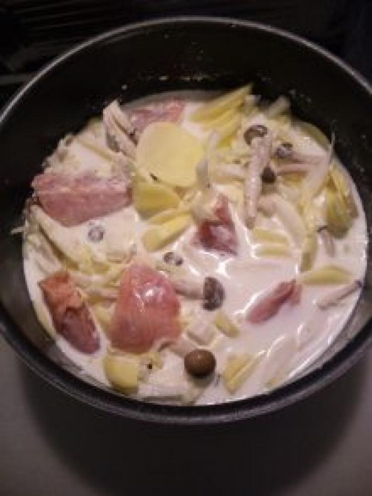 ![]() まず鍋に玉葱、白菜、ジャガ芋、しめじ、鶏肉の順に乗せる。小麦粉、生クリーム、牛乳、水を入れて塩コショウとコンソメを入れる