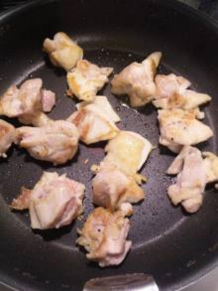 ![]() フライパンに少しの油をひき鶏肉を焼いていく。