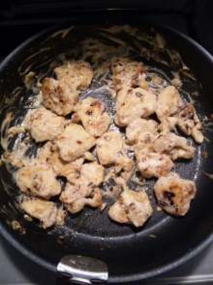 玉ねぎはみじん切りにし、フライパンに少量の油を入れ水分が無くなるように炒める(中火)。炒まったら片栗粉を付けたむね肉を投