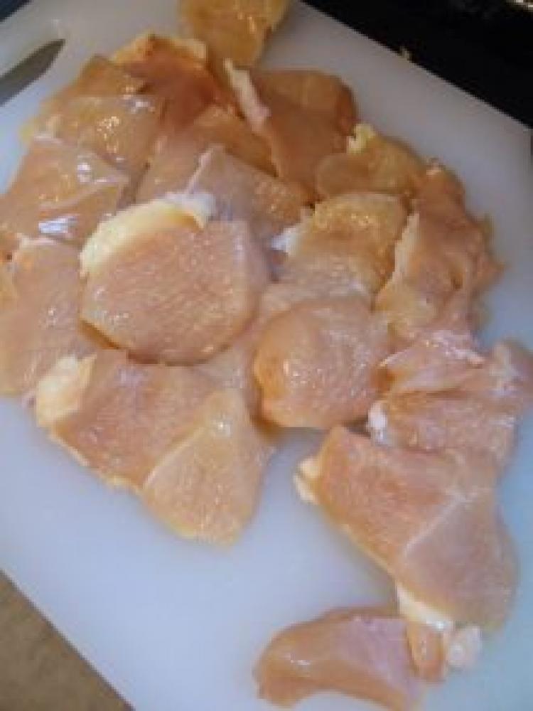 ![]() まず鶏むね肉を削ぎ切りにする。