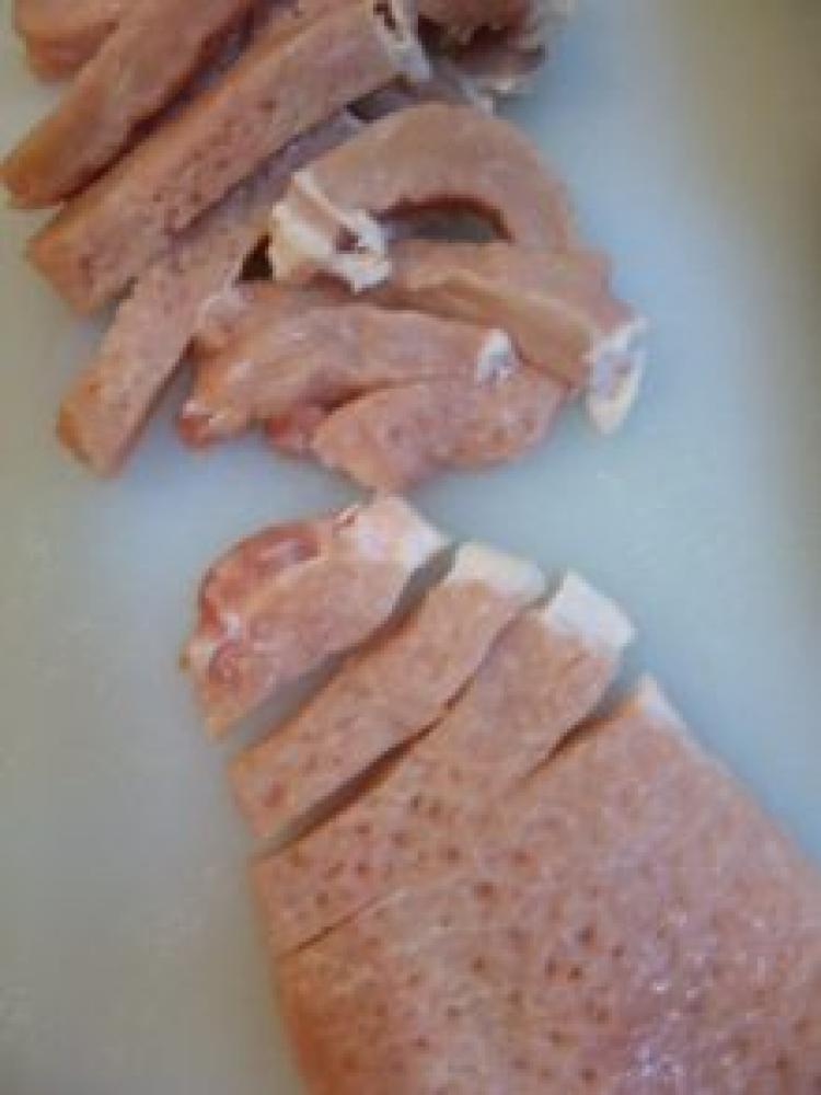 ![]() 肉は筋切りし、肉たたきで叩く。1cmの幅に切る。