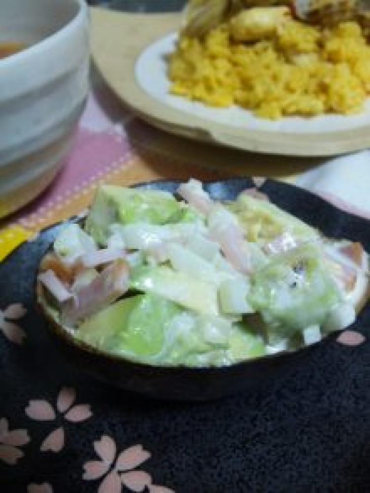 アボカドを半分にくり抜き1cm程の角切りにする。ボウルの中にアボカドを投入してあえれば完成。 |