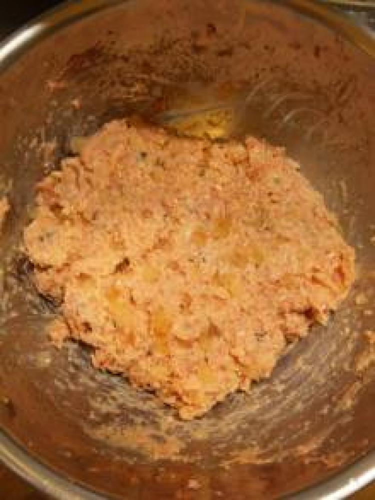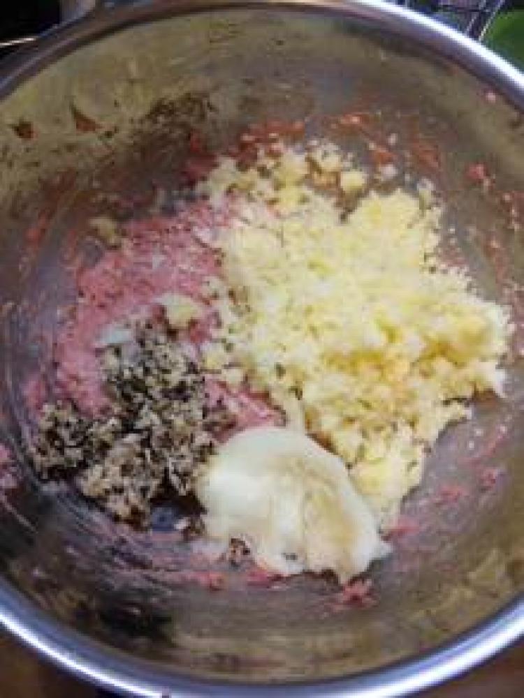![]() ガーゼなどを使い、それぞれ水分をよく絞って、寝かせておいた挽肉と混ぜる