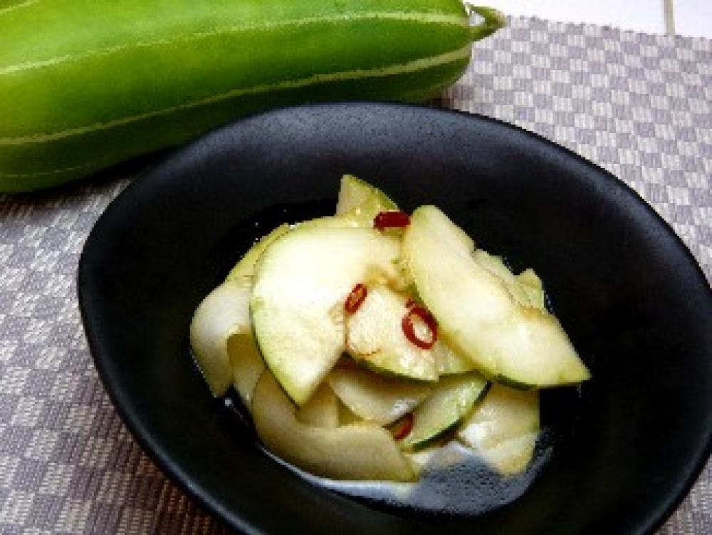 うりは種を除き、うすくスライスする。唐辛子は種を取りぞそき、輪切りにする。