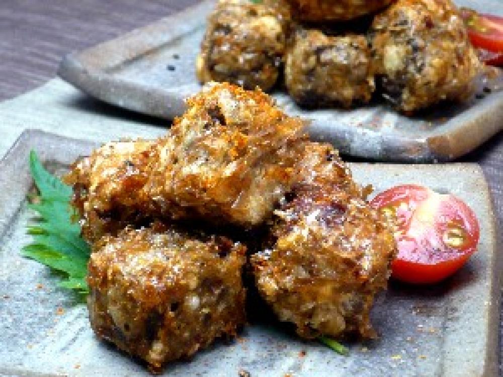 (4)に衣をつける。小麦粉、卵白、かつおぶしの順でつける。