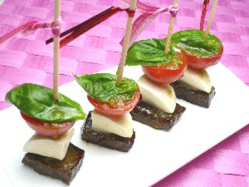 バジル、トマト、チーズ、牛肉の順に串に刺す。<A>のソースをつけて出来上がり。