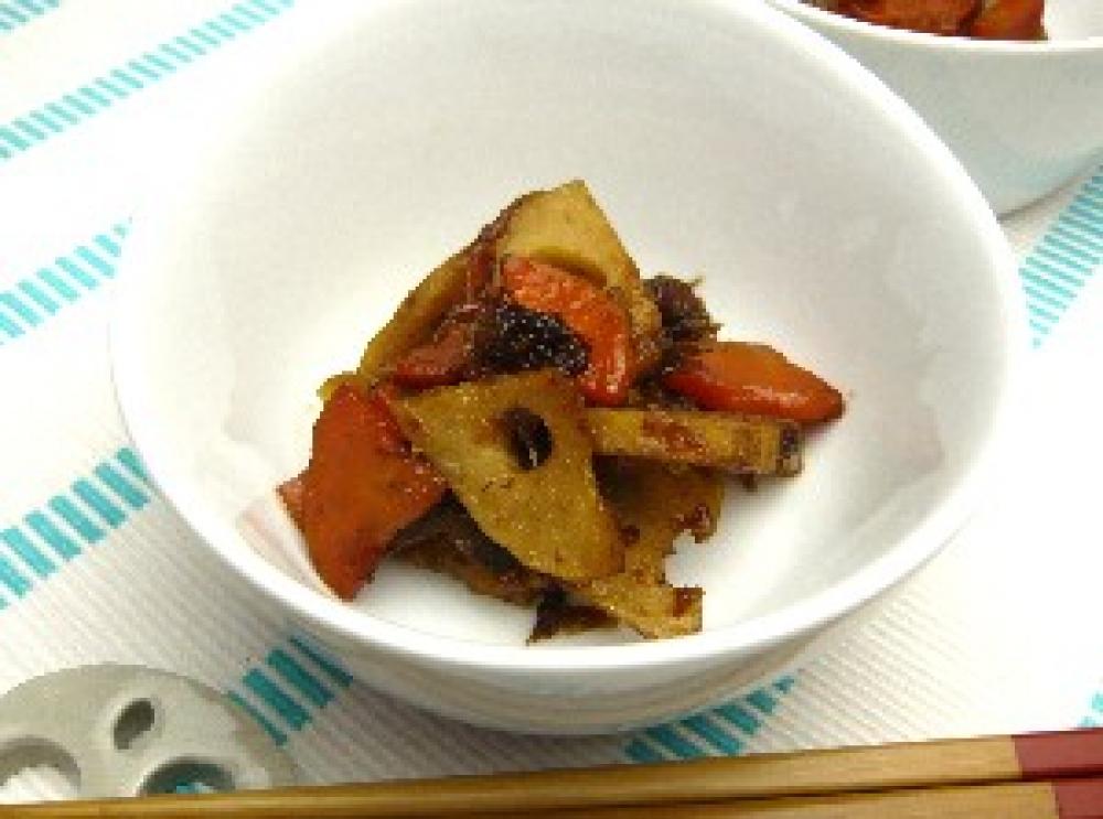 フライパンに油を熱し、にんじんと、水気を切ったれんこんを炒める。