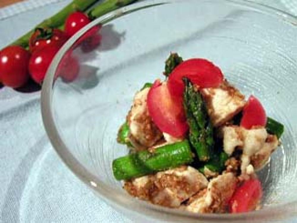 塩少々を入れた熱湯で鶏肉をゆで、色が変わったらアスパラも加えて約1分ゆでる。