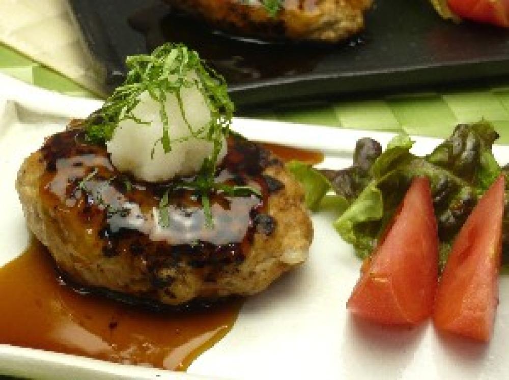 お皿にハンバーグを盛りつけ照焼きソースをかけ、大根おろし、大葉をのせる。