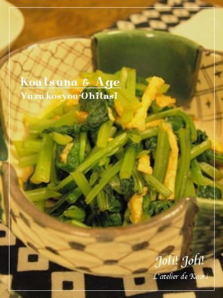 小松菜のおひたしにカリカリお揚げさんをまぜて、出汁と醤油と柚子胡椒をあえて出来上がり。
