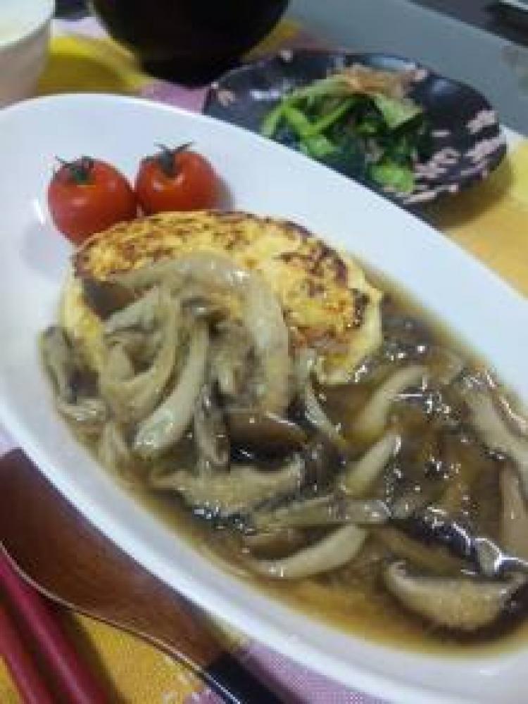 ![]() あんを作る。別のフライパンか小鍋に、裂いたきのこを入れ炒める(油不使用)。炒まったら◇を入れてとろみをつけたら完成~~。