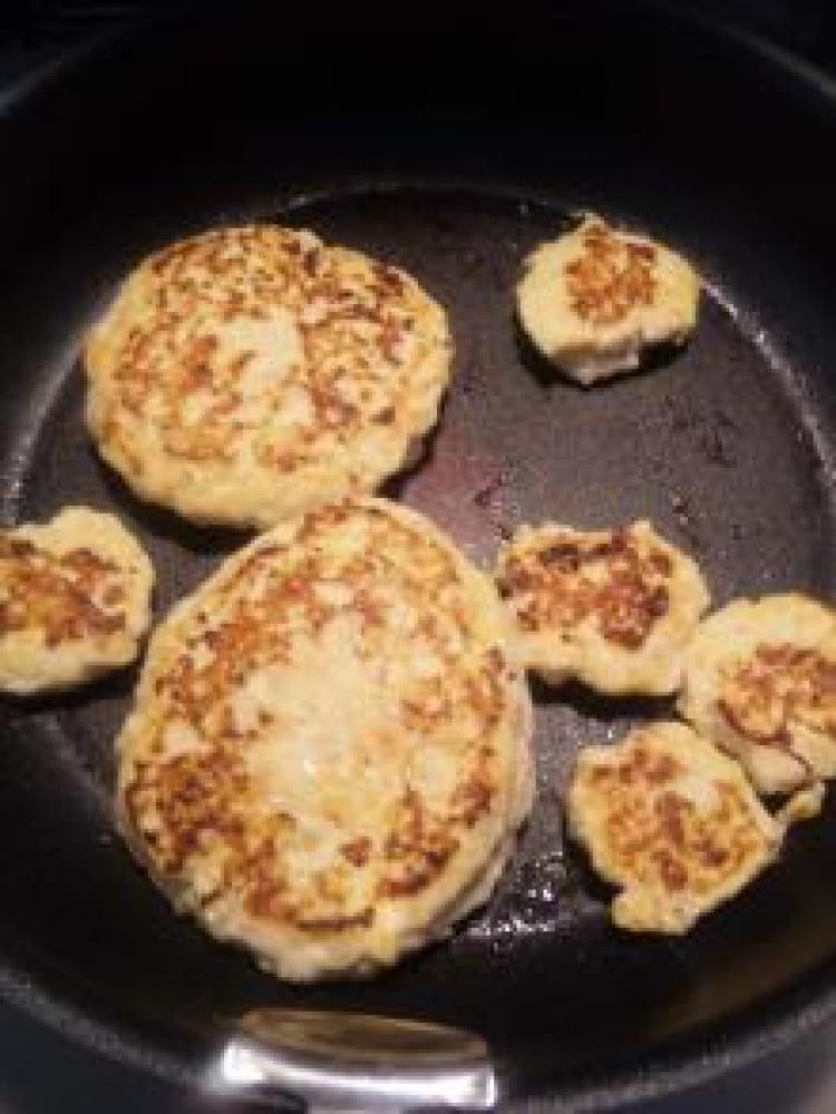![]() フライパンに油をひき、中火~弱火で焼く。片面焼いた後、弱火にし蓋をして中まで火が通ったら完成。