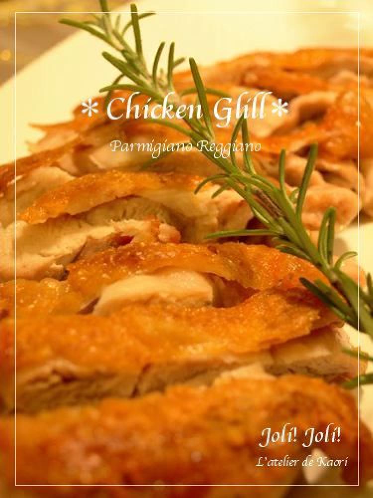 鶏モモ肉の皮面にパルメザンチーズをまぶし付けてくっつけます。