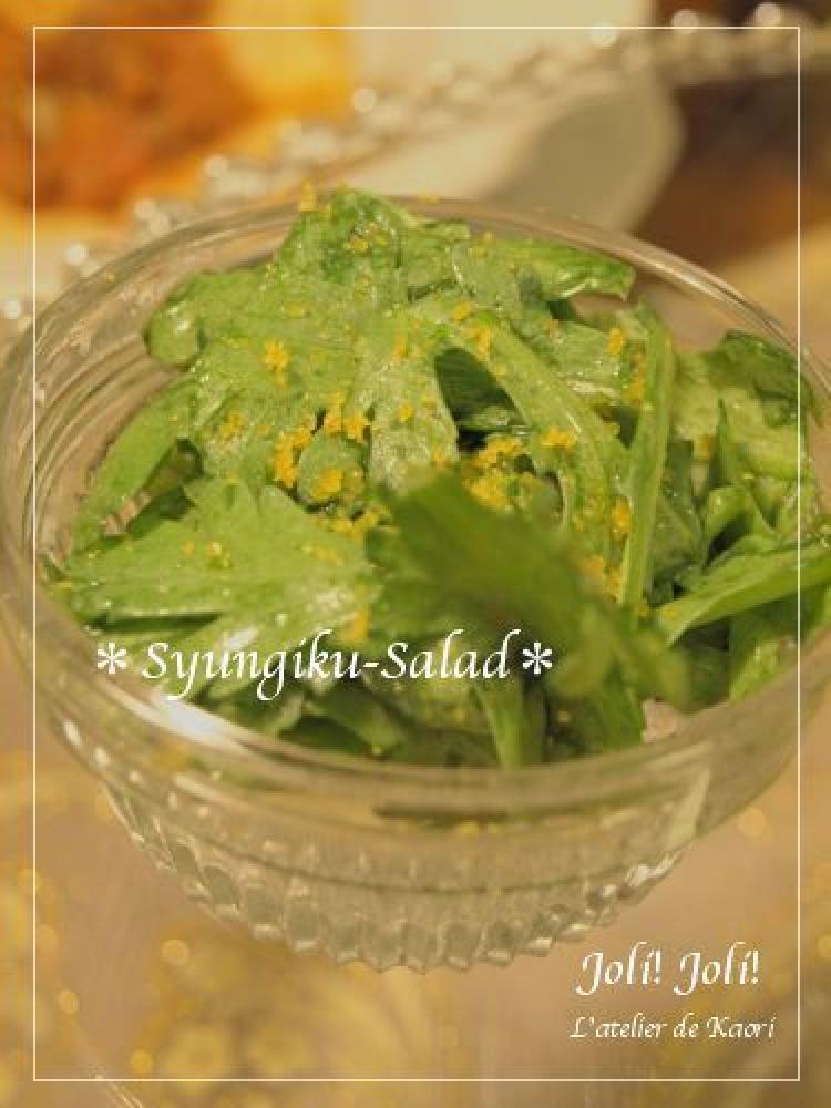 春菊を食べやすい大きさに切って盛り付け、ドレッシングをかけます。