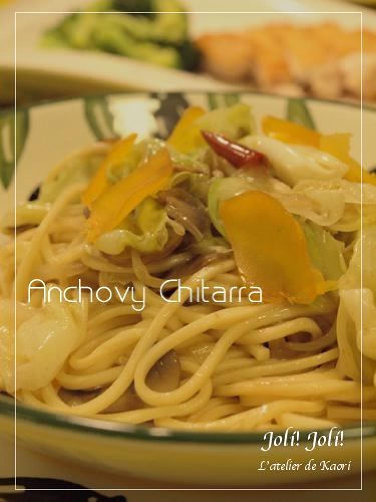 アンチョビ、ゆでたパスタを加えて味を絡めて完成。