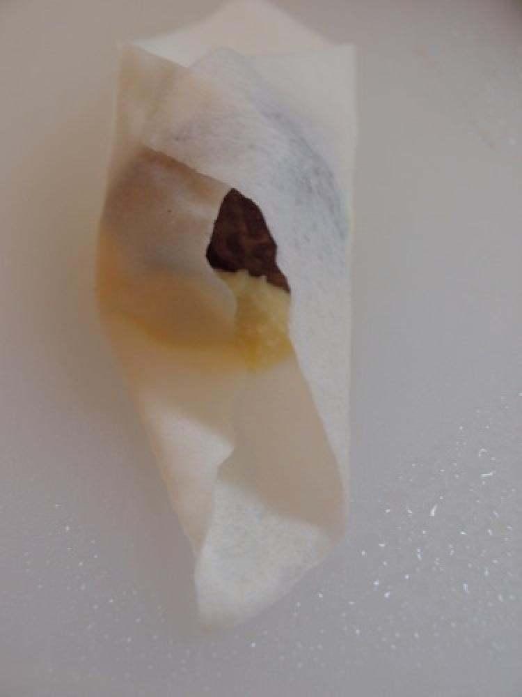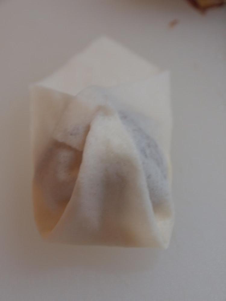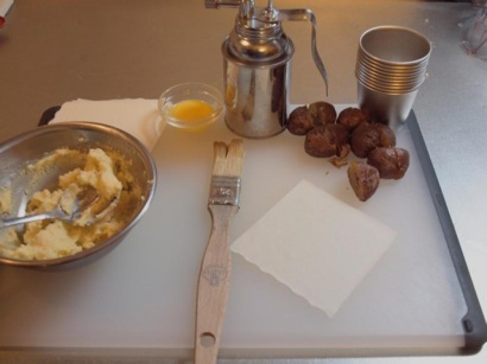 あらかじめ、春巻きの皮は4等分、マロングラッセは2等分しておきます。 |