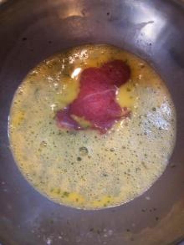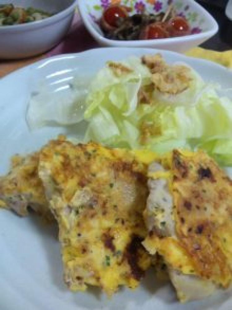 ![]() 肉の間にチーズを挟み、中身が出ない様に卵液につける。
