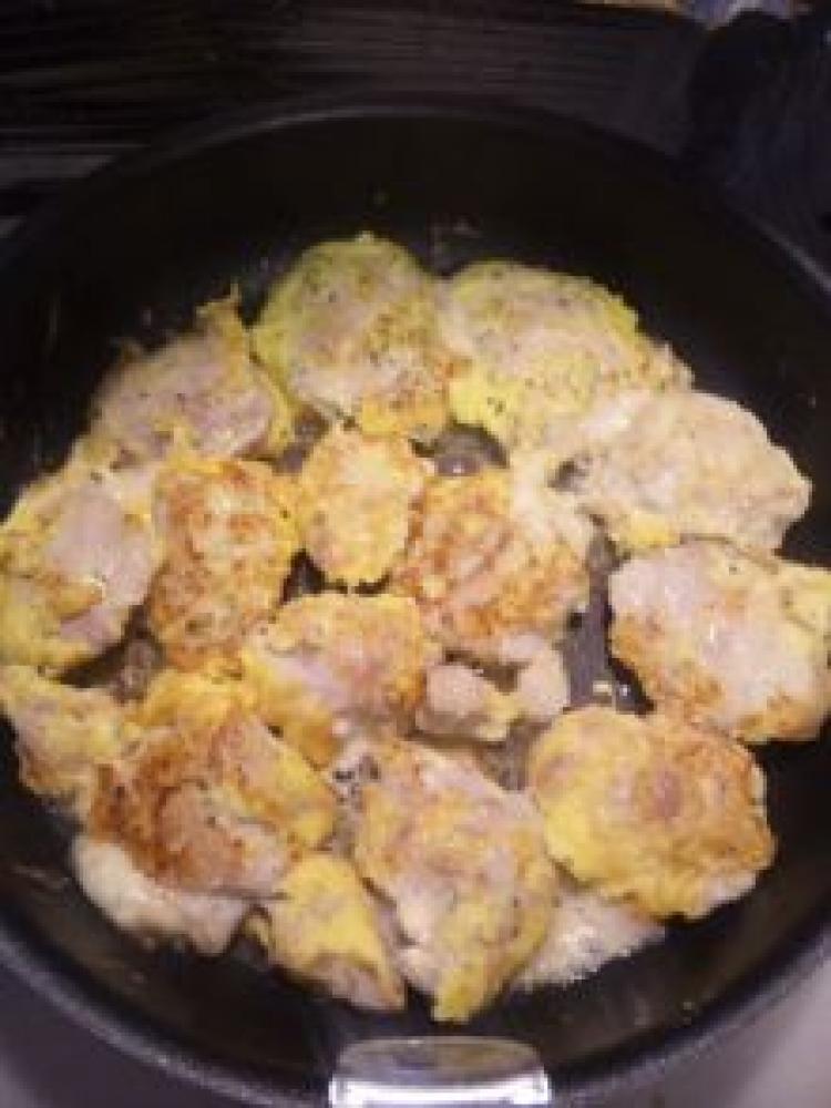 フライパンにバターを溶かし肉を焼く。中火で片面焼き、ひっくり返して火を弱め蓋をして中まで火を通す。