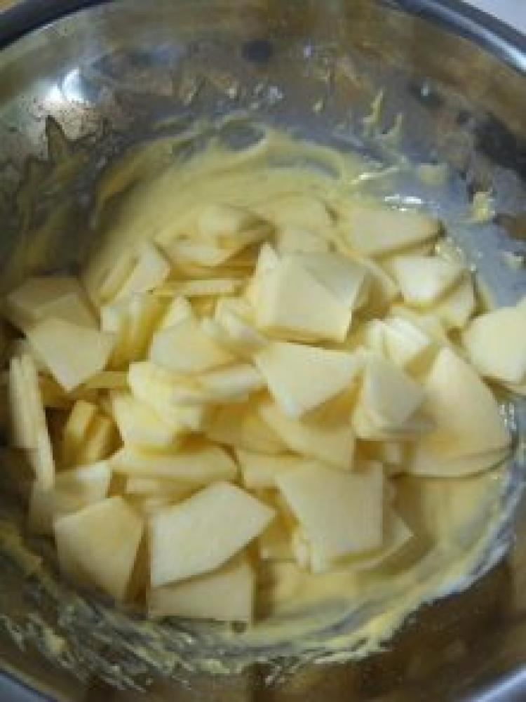 ![]() 焼き型にオーブンシートをひく。りんごをいちょう切りにしてレモン汁をかけて置いておく。
