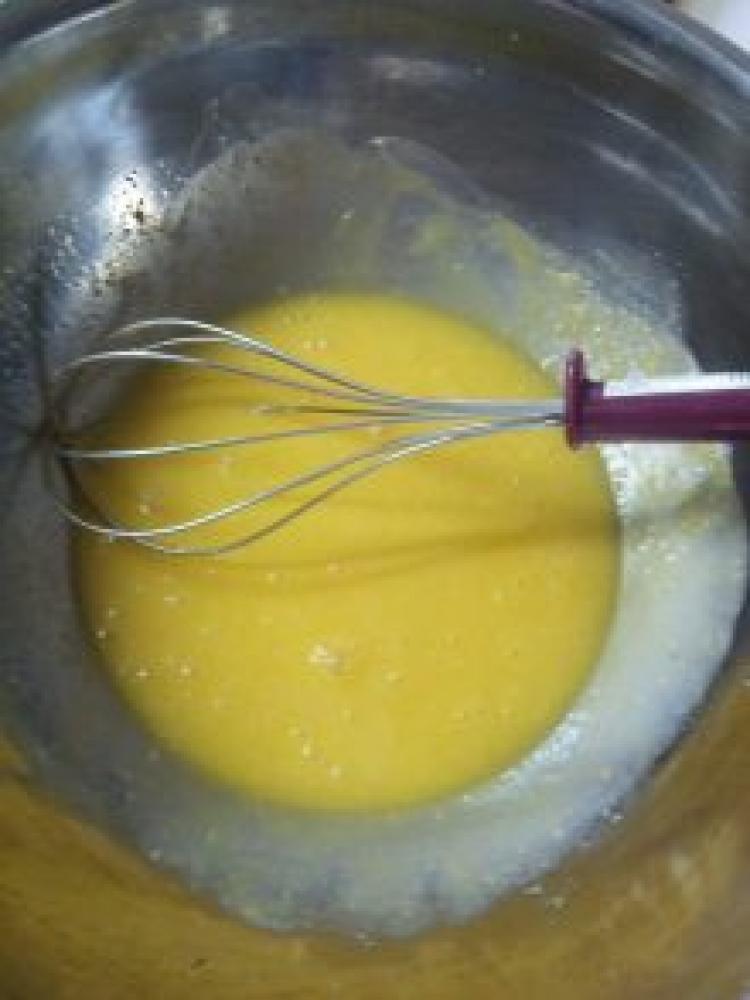 ![]() ボウルに卵、砂糖、メイプルシロップを入れて混ぜ、さらにバター、牛乳を入れて混ぜる。