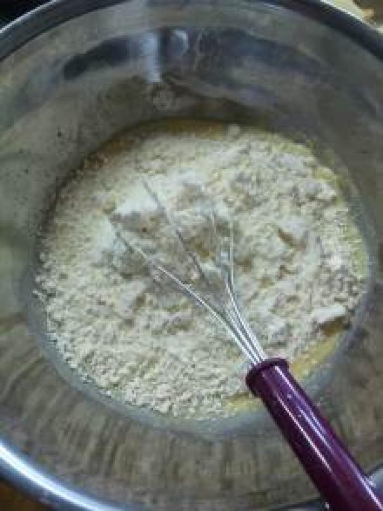 ![]() 混ざったらホットケーキミックスをドバっと入れて混ぜる。